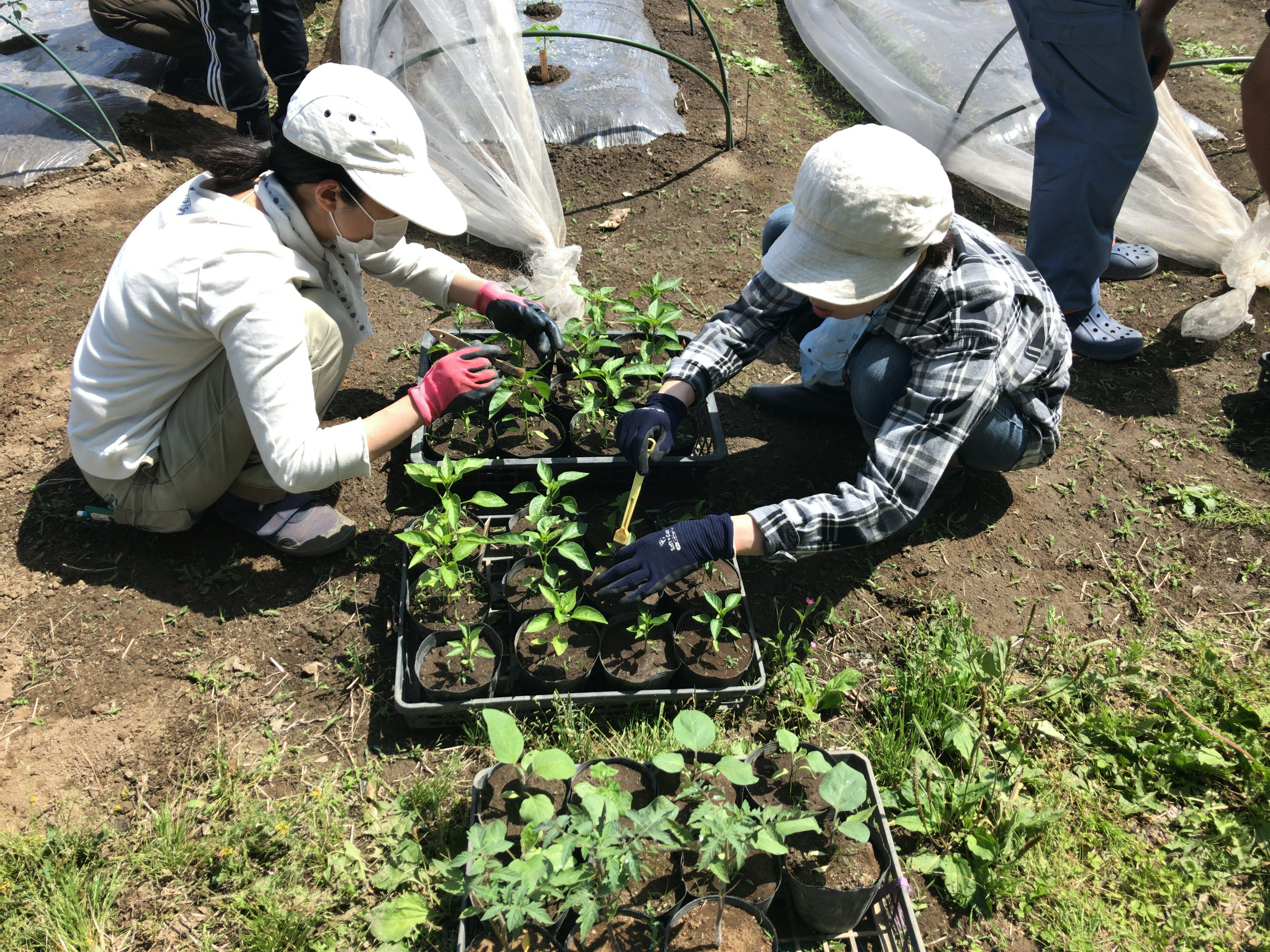 5月4日(土)の自然栽培の会では、真黒ナス、アロイトマト、万願寺唐辛子、魁ピーマンの苗の定植を行います。 定植後は風による苗の倒伏防止のために、防虫ネットを畝に被覆します。 その後は前回種蒔きを行った相模半白キュウリの鉢