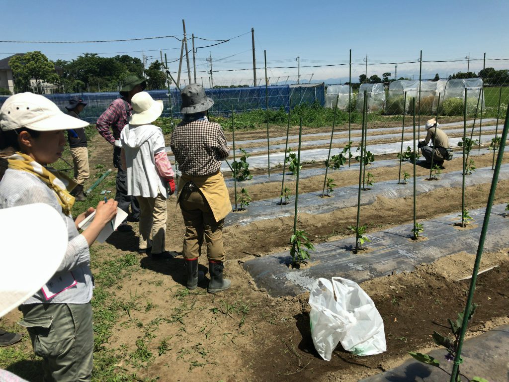 6月17日(土)の自然栽培の会では、まず前回支柱に誘引を始めた作物の観察を行い、必要なものはまた誘引作業を行います。