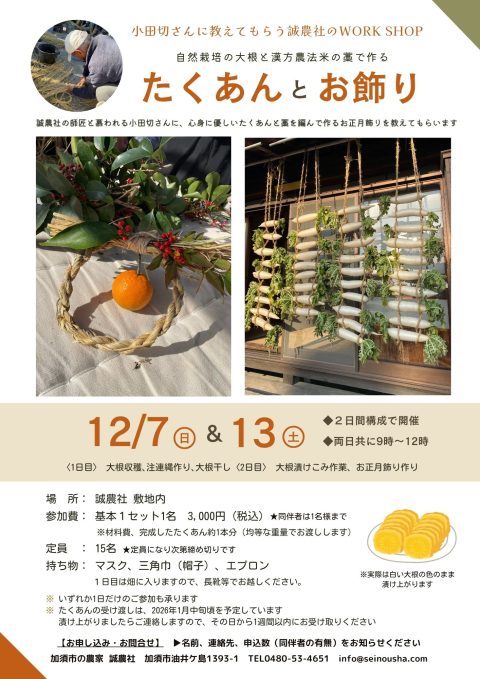 誠農社の師匠と慕われる小田切さんに教えてもらう 自然栽培の大根を漢方農法米の糠で漬け込む「たくあん」と 漢方農法米の藁で注連縄を編んで作る自分だけの「お飾り」のワークショップです。 このイベントを開催させて