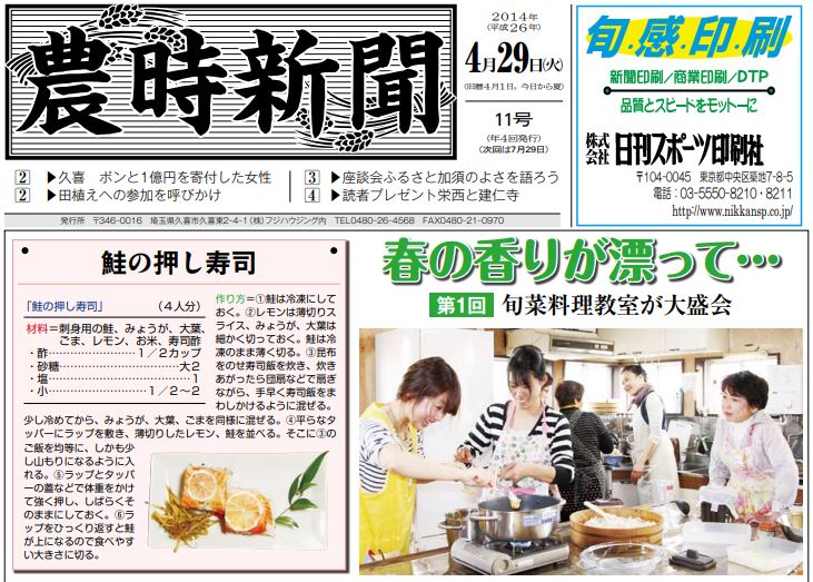 農時新聞第11号 2014年4月 PDF 旬菜料理教室が大盛会 久喜 ポンと1億円を寄付した女性 田植えへの参加を呼びかけ 座談会ふるさと加須のよさを語ろう 読者プレゼント栄西と建仁寺 農時新聞は久喜・加須市の市民約6万