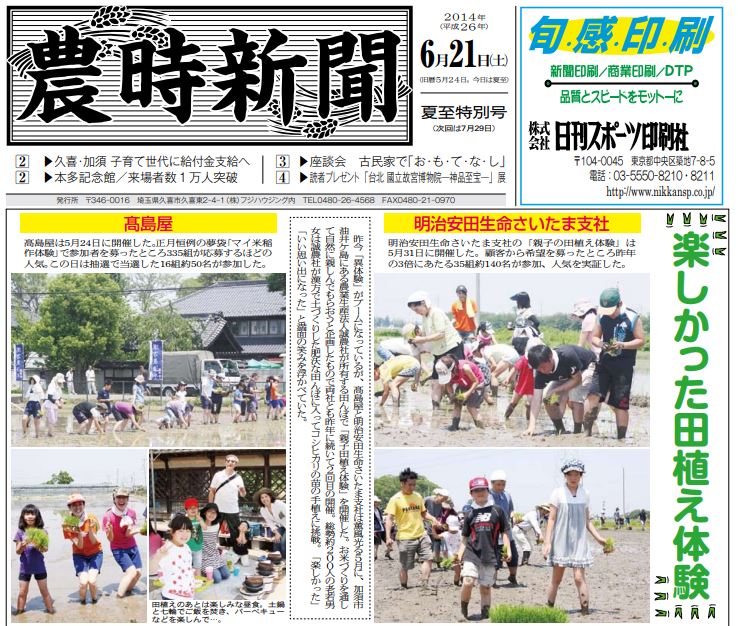 農時新聞夏至特別号 2014年6月21日 PDF 楽しかった田植え体験 久喜・加須 子育て世代に給付金支給へ 本多記念館/来場者数1万人突破 座談会 古民家で「お・も・て・な・し」 読者プレゼント「台北 國立故宮博物院―