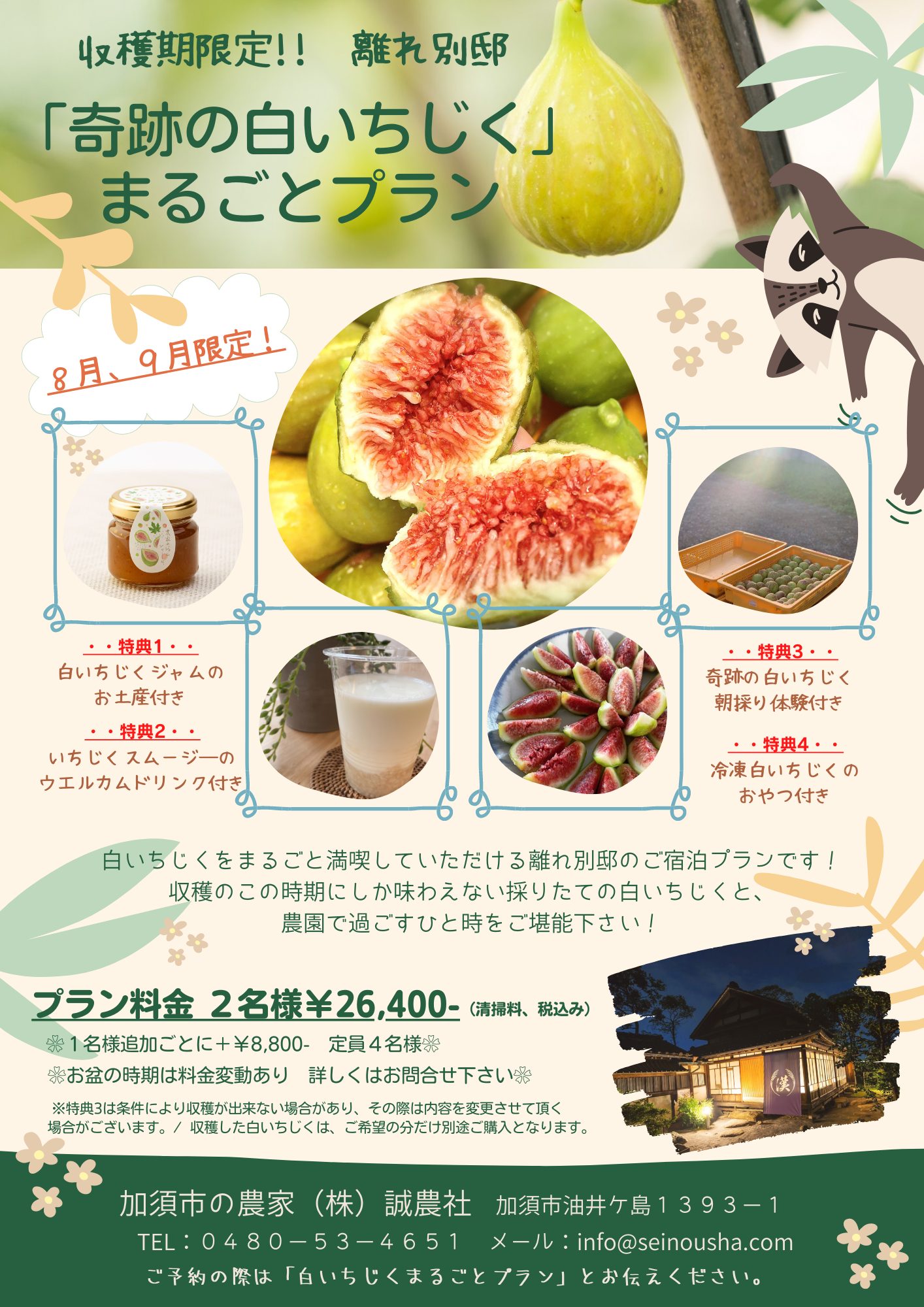今年も夏がやってきました! 農園の白いちじくも順調に実っており、8月中旬頃から収穫が出来る予定です。 宿泊施設の離れ別邸では、この時期に合わせたうれしいプランをご用意しました! 名付けて 「離れ別邸 奇跡の白いちじく丸ご
